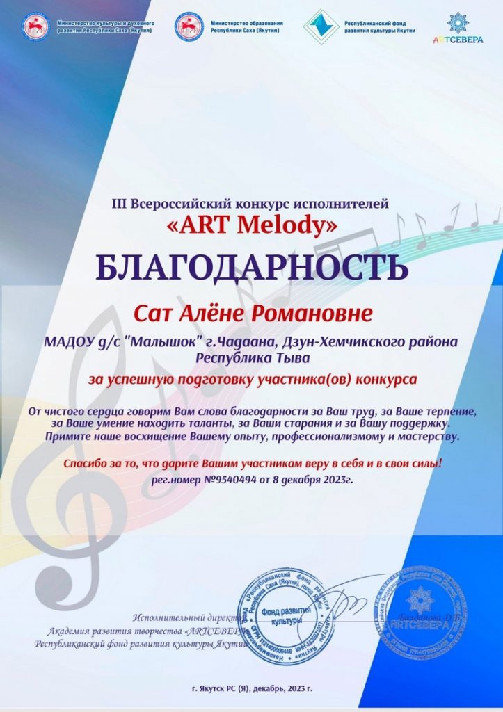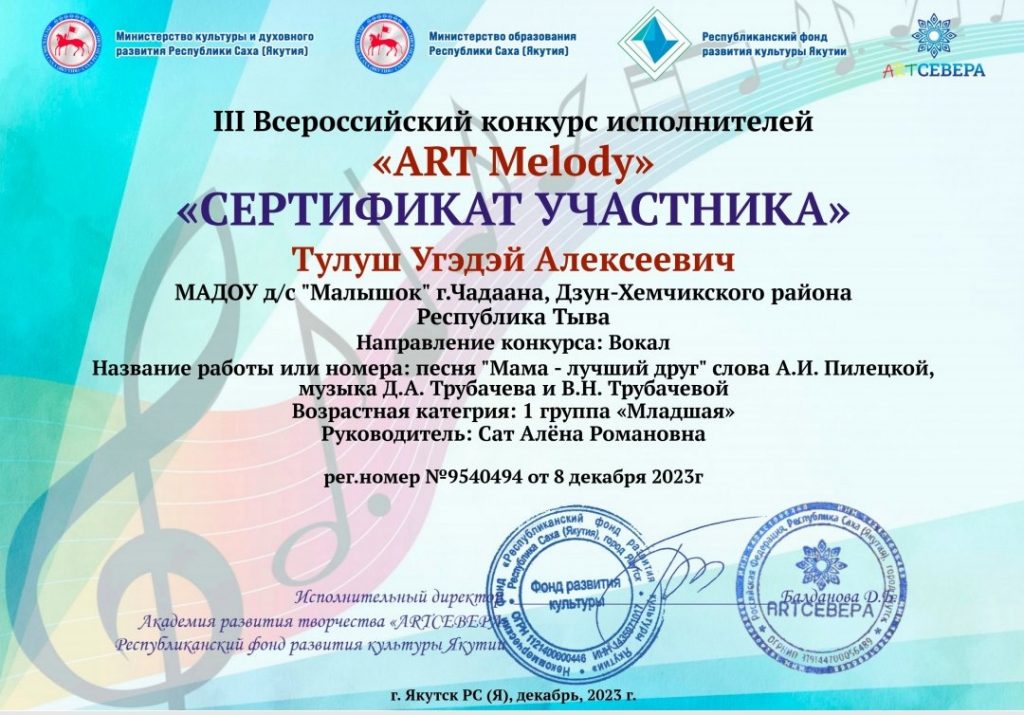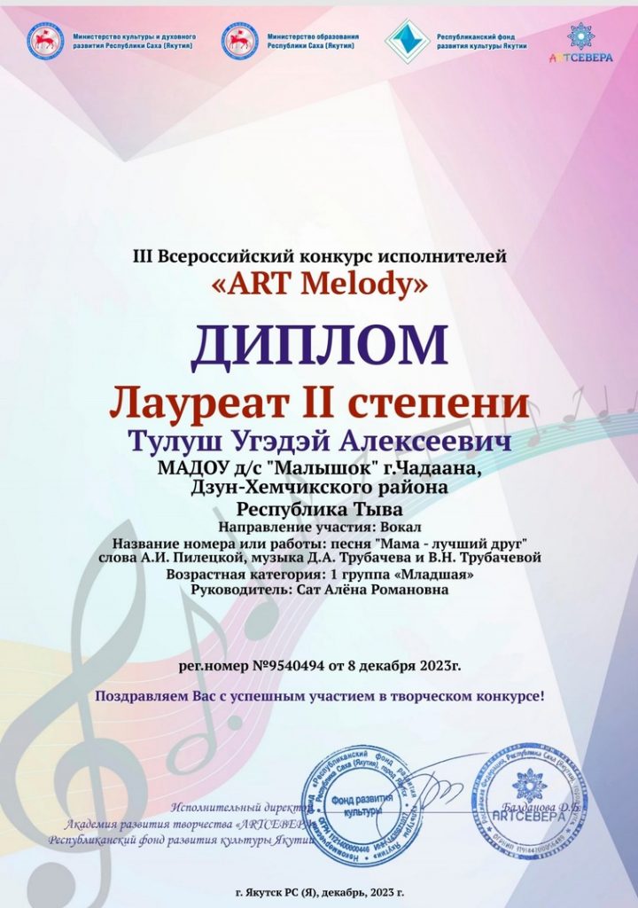 без рубрики 06.01.2024 / Воспитанник подготовительной к школе группы «Любознайки» Тулуш Угэдэй стал лауреатом II степени на III Всероссийском конкурсе исполнителей «ART Melody» . Наши поздравления!!!