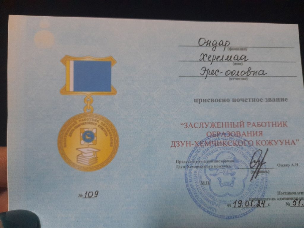 И сегодня наша коллега Ондар Херелмаа Эрес-ооловна получила почетное звание «Заслуженный работник образования Дзун-Хемчикского кожууна».