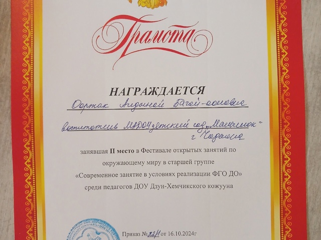 Сегодня 16.10.2024 года на базе детского сада «Хунчугеш» с. Хайыракан был проведен фестиваль открытых занятий по окружающему миру среди педагогов детских садов кожууна. Целью данного фестиваля является повышение престижа педагогического труда, поддержка новых технологий в организации образовательного процесса, рост профессионального мастерства педагогических работников. По итогам протокольного решения жюри в старшей группе: