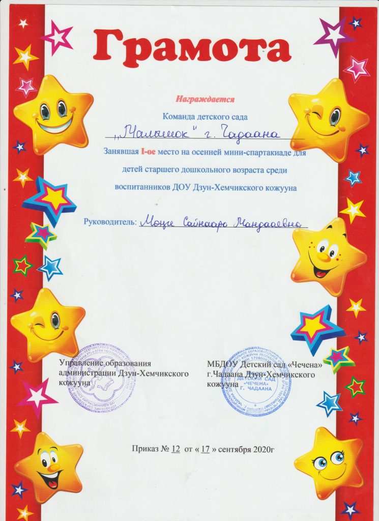 Команда детского сада «Малышок» г.Чадаана заняли 1 место на осенней мини-спартакиаде для детей старшего дошкольного возраста среди детей воспитанников ДОУ Дзун-Хемчикского кожууна. Руководитель: Монге Сайнаара Мандааевна.