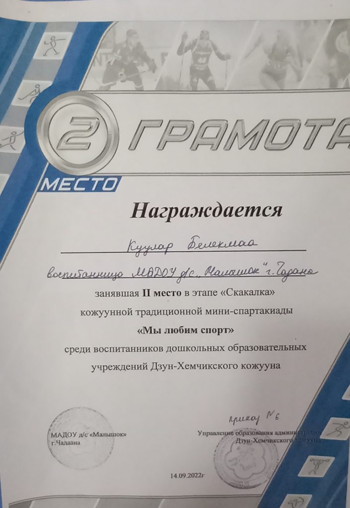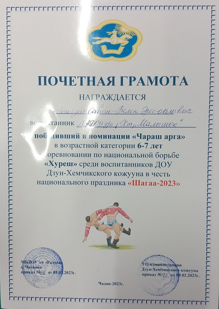 09 февраля 2023 года по категориям 4-5, 6-7, лет в соревновании по национальной борьбе «Хуреш» среди воспитанников ДОУ Дзун-Хемчикского кожууна в честь национального праздника «Шагаа-2023» Монгуш Сайын-Белек победитель в номинации «Чараш арга», Сарыглар Саян победитель в номинации «Чараш арга».