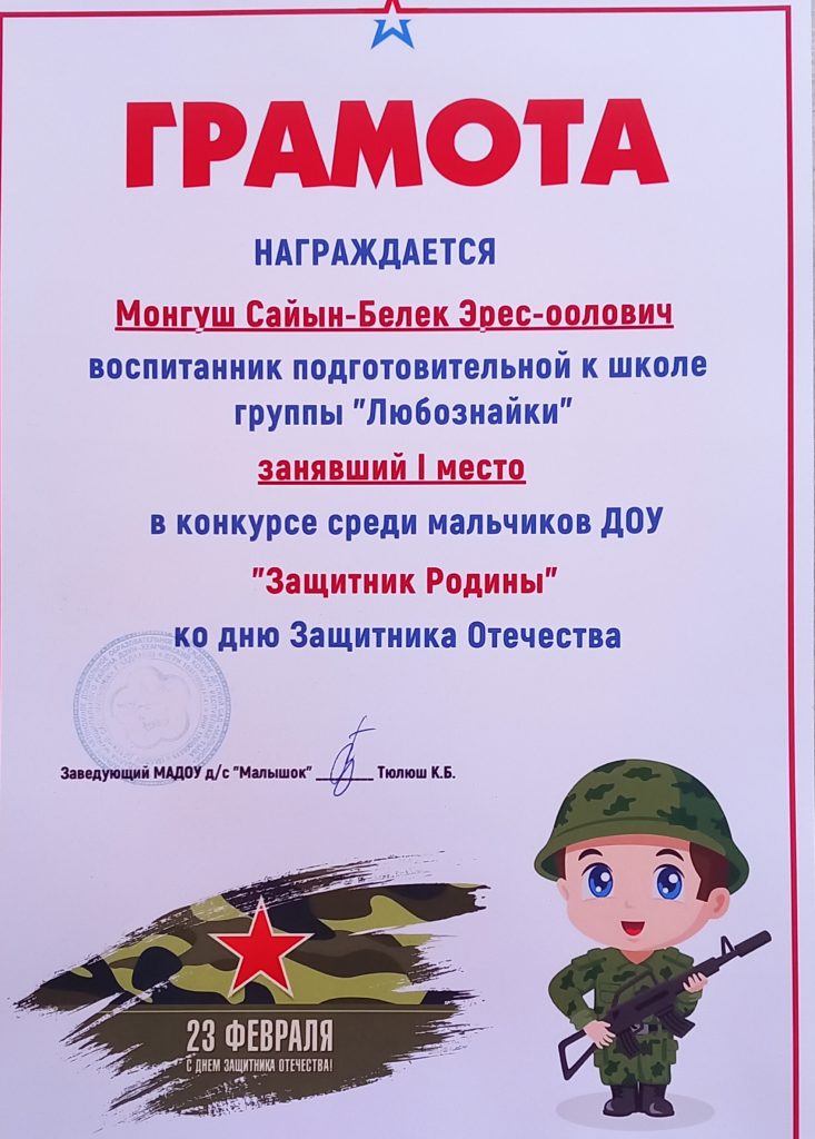 В нашем детском саду «Малышок» г. Чадаана 03 февраля 2023 года среди воспитанников 4-5 лет, 6-7 лет прошел национальный турнир по борьбе «Хуреш». В возрастной группе 6-7 лет участвовали 13 мальчиков, среди них 1 место занял Монгуш Сайын-Белек, 2 место — Саая Эртине, 3 место — Кара-Сал Начын. В номинации «Тергиин содак-шудак» был удостоен Сат Сулдем, «Чараш арга» — Ондар Саша, «Чараш девиг» — Эм Саша. В возрастной группе 4-5 лет участвовали 15 мальчиков, среди из них 1 место занял Сарыглар Саян, 2 место — Кара-Сал Чингис, 3 место — Монгуш Найдан. В номинации «Тергиин содак-шудак» был удостоен Тулуш Угедей, «Чараш девиг» — Монгуш Байыр, «Чараш арга» — Монгуш Дун-Херел Поздравляем всех наших участников!!!