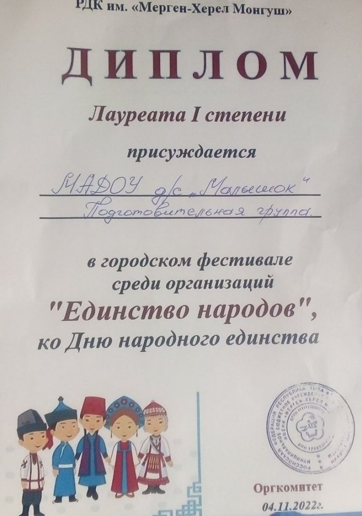 4 ноября 2022 года воспитанники подготовительной к школе группы «Любознайки» принимали участие в конкурсе «Единство народов» ко Днб народного единства среди организаций и стали лауреатами I степени.